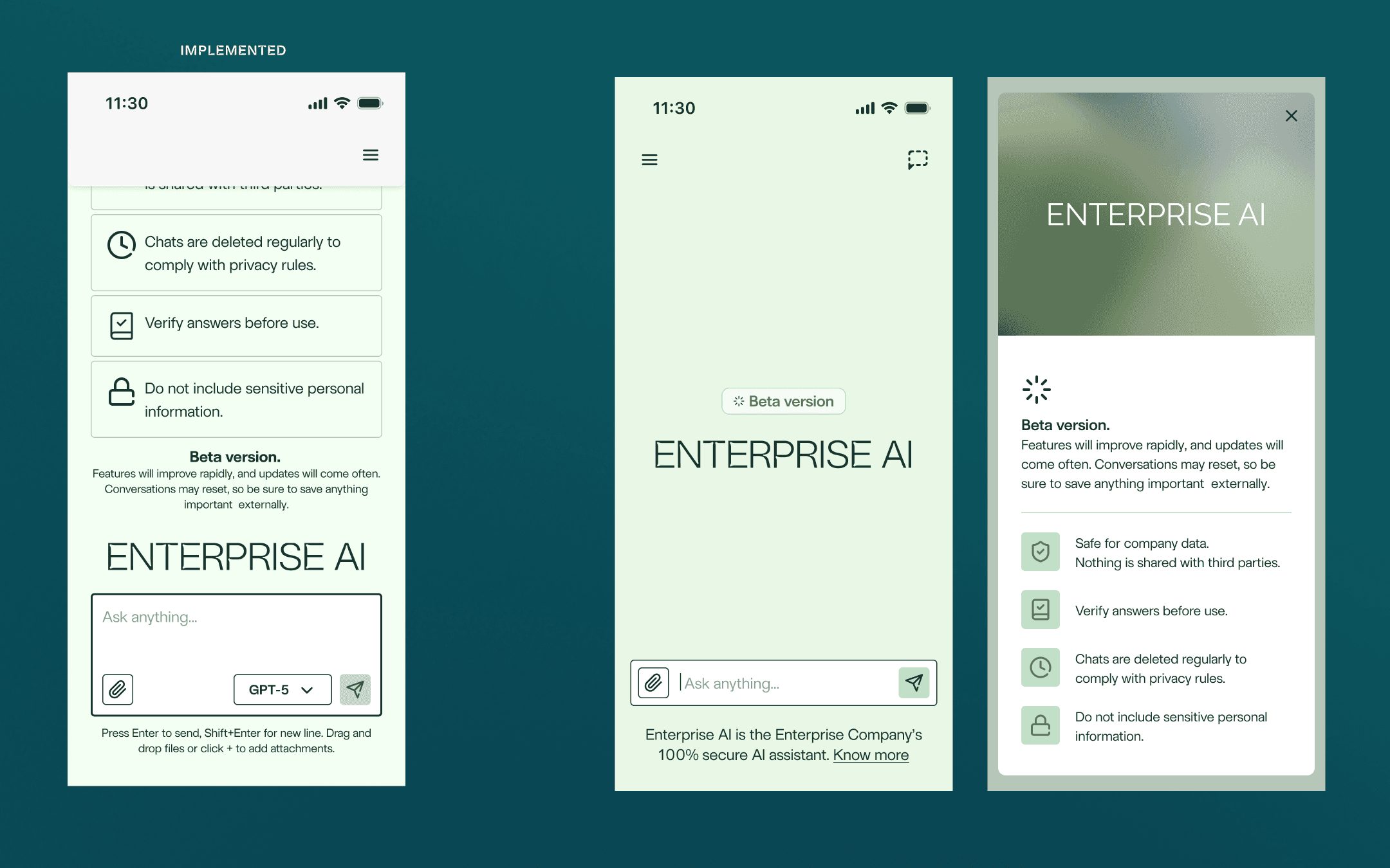 Employees confronted with a new AI tool carry legitimate questions: is this safe, what are my limits, what am I accountable for. The obvious design answer was a disclaimer. I chose a different framing: governance as a feature of the first experience, not as legal cover appended to it.
